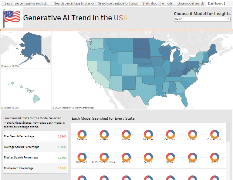 Create an interactive dashboard in Tableau to draw insights into the search trend for different generative AI models in early 2024.